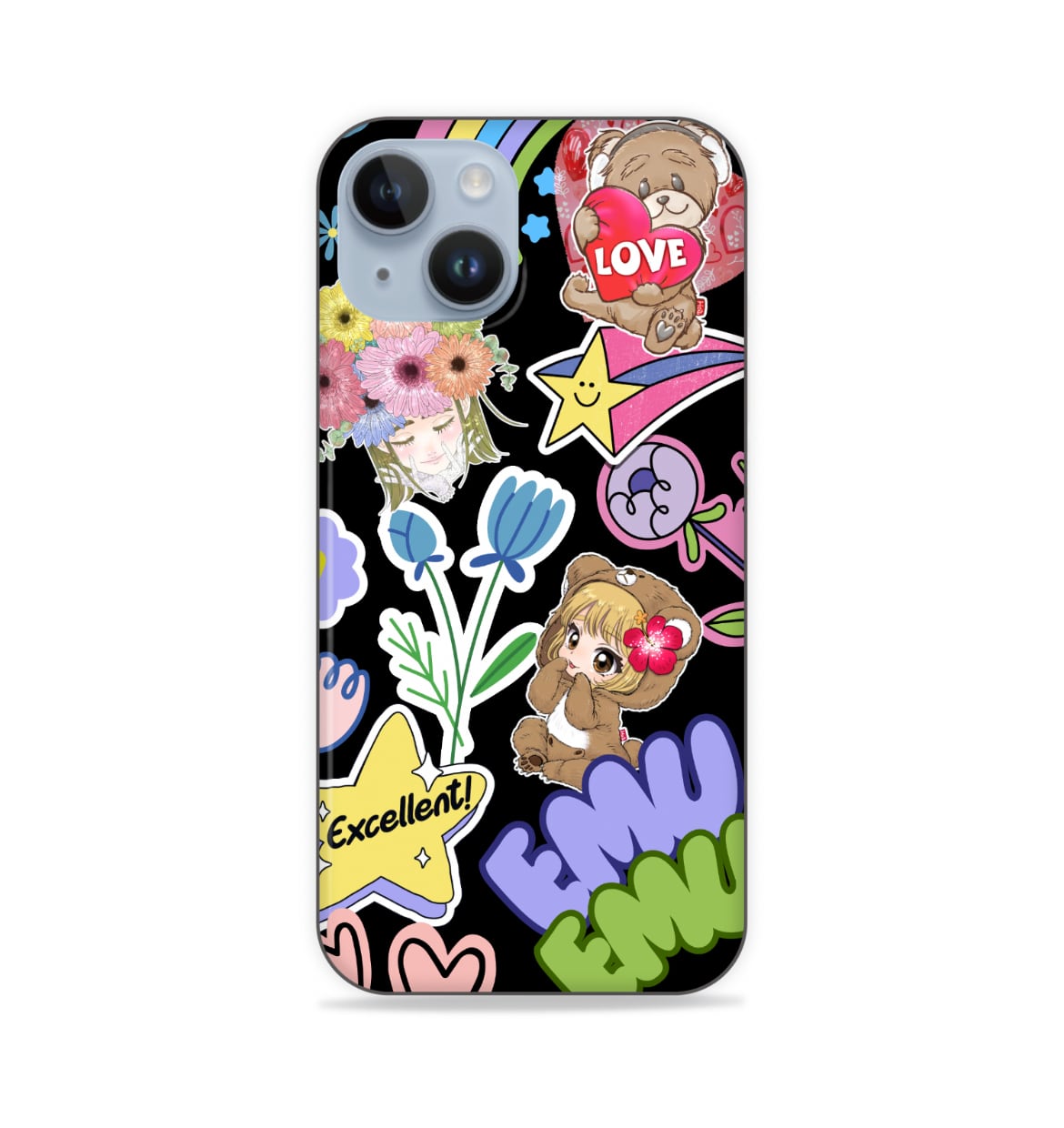 Emuオリジナルステッカーを散りばめたキュートなスマホケースです。